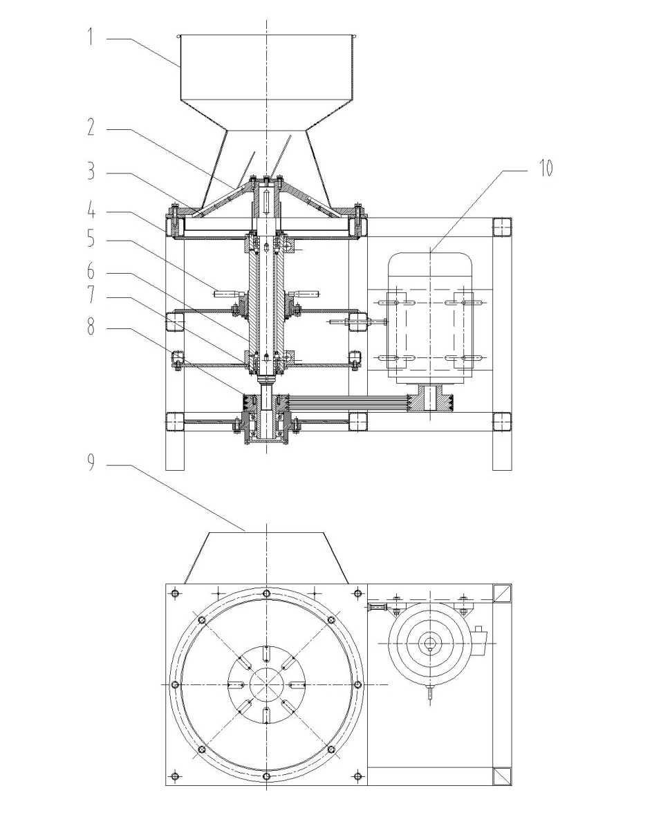 1、進料斗;2、齒刀片;3、刀盤;4、機架;5、轉(zhuǎn)子升降機構(gòu);6、軸承架;7、軸承;8、皮帶傳動機構(gòu);9、出料斗;10、電機