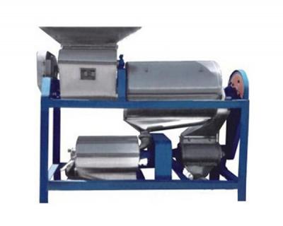 石榴榨汁機(jī)結(jié)構(gòu):該機(jī)主要由料斗、上粉碎裝置、下破碎裝置、旋轉(zhuǎn)篩、攪拌軸、螺桿泵、機(jī)架等組成。除傳動(dòng)部分外,本機(jī)采用全不銹鋼制造。攪拌軸采用變頻調(diào)速。工作原理:石榴從料斗進(jìn)入上粉碎裝置,上部破碎裝置按下石榴開,兩輥之間的間隙為20 mm,然后進(jìn)入下粉碎裝置。下部粉碎裝置再次擠壓石榴,兩輥之間的間隙為10 mm,兩階段擠壓后的石榴籽基本與皮籽分離,并落入分離裝置。在攪拌軸的攪拌下,石榴種子從篩孔脫落,石榴皮從尾部排出,上下壓輥為彈性結(jié)構(gòu)。間隙是可調(diào)的。